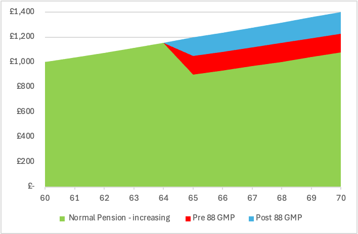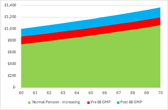 The graph below shows a pension for a 60-year-old man. This is before we convert GMP. You can see how his pension is made up differently from age 65.